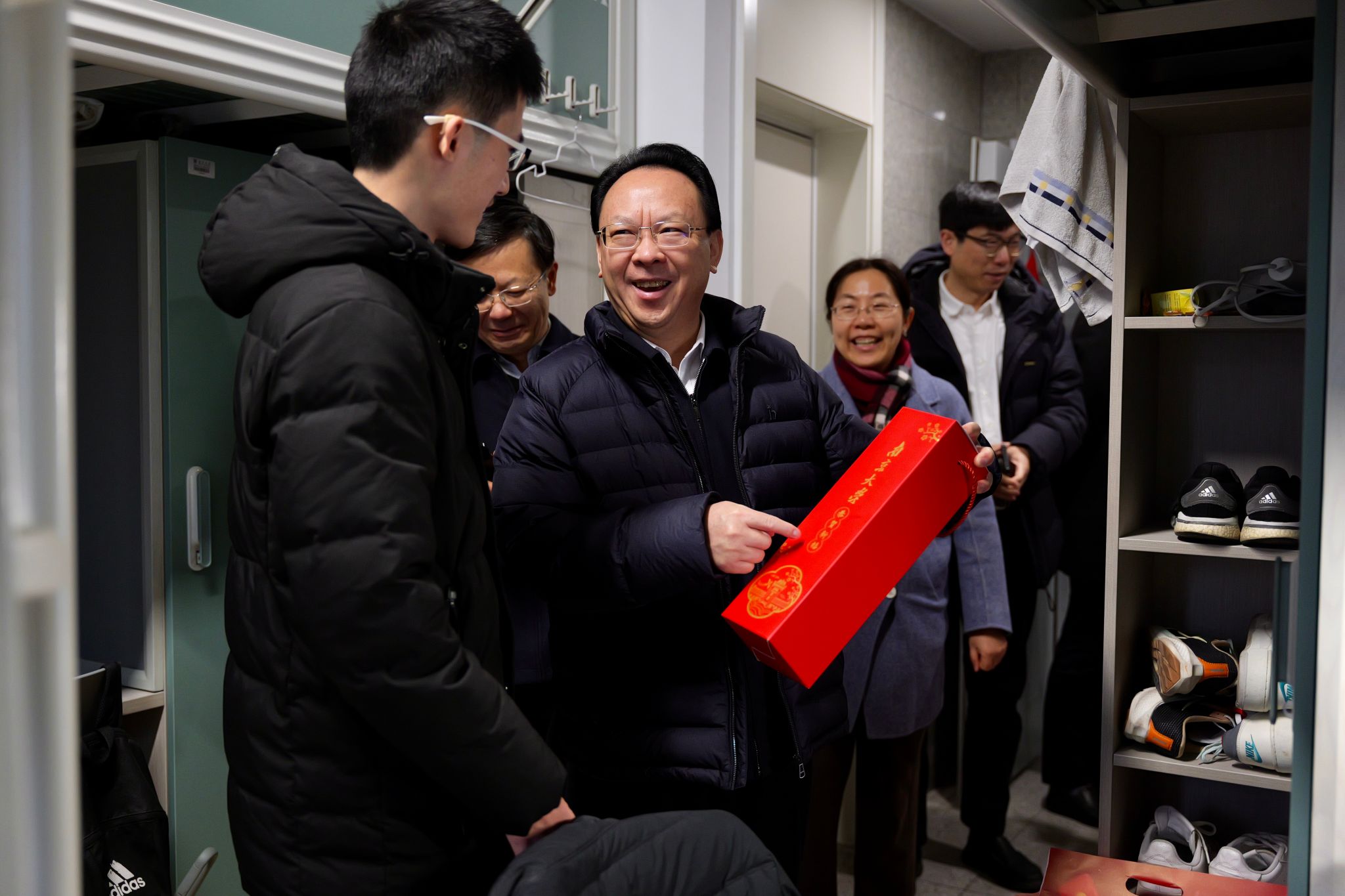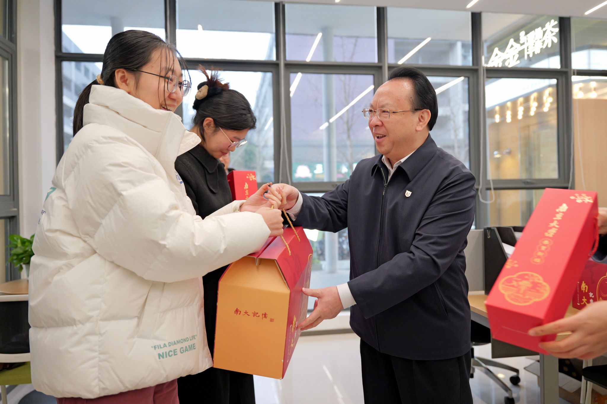 On January 26, as the Chinese New Year is approaching, Tan Tieniu, Chair of NJU CPC Council and Academician of the Chinese Academy of Sciences visited teachers, students and staff staying on campus and sends his warmest regards to them. Tan firstly visited dormitories and exchanged with students. While sending them New Year gift packages, he said to them that NJU is students' family, hence the university will make careful arrangements and make sure every student can enjoy the Spring Festival just like at home.