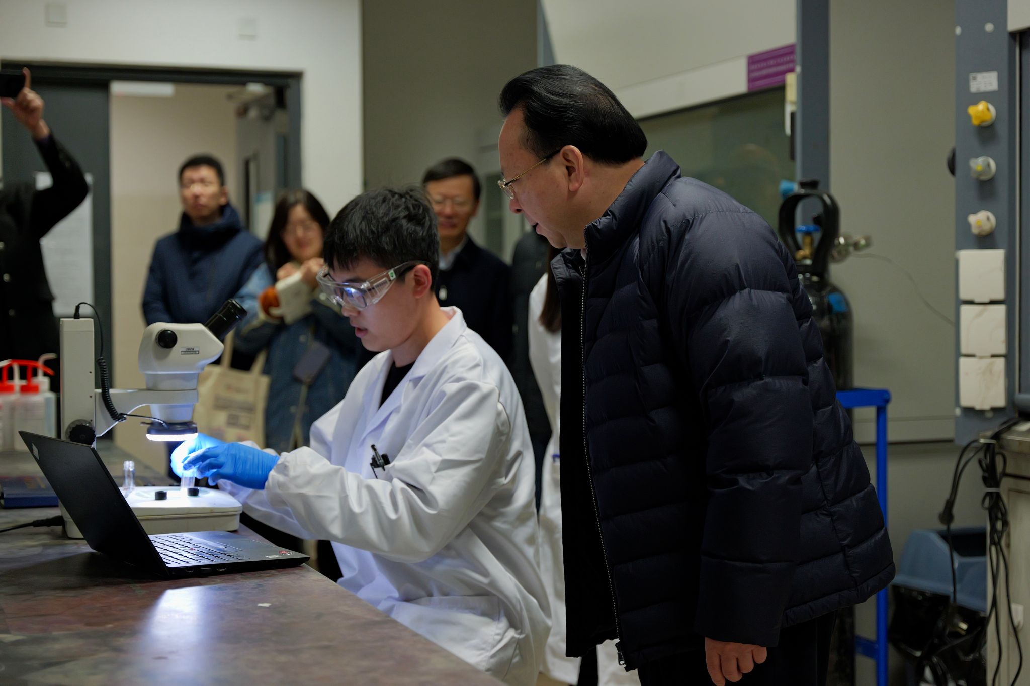 He also visited teachers and students who were still working in laboratories. He carefully checked the operation of the laboratory monitoring and early warning system of the School of Chemistry and Chemical Engineering and stressed the absolute necessity to strengthen the real-time monitoring and management of hazardous chemicals, resolutely guard against all kinds of risks, and put an end to potential safety hazards.