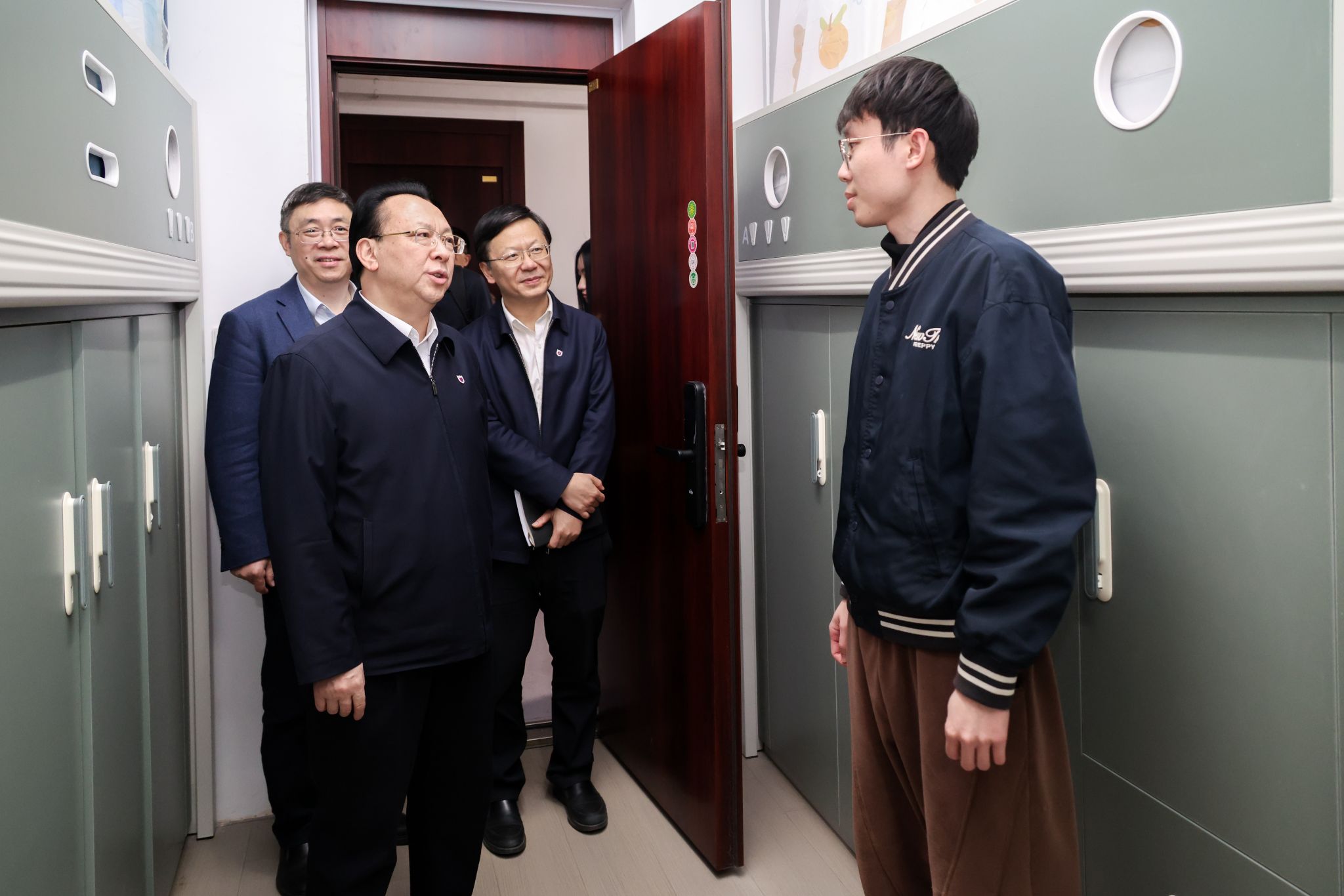 After the lecture, Tan Tieniu visited various places on Pukou Campus, including the Yuhui Building, the Zuo Dijian Sports Hall,the dormitories 17-21 and the No. 15 Student Canteen. During his visits, Tan Tieniu emphasized that responsible persons from relevant departments should truly understand students' thoughts and concerns and promptly solve urgent issues like commuting difficulties by optimizing bus routes and accelerating subway line construction, creating a comfortable, secure, and joyful campus environment at Pukou Campus, enhancing students' sense of belonging and happiness.
