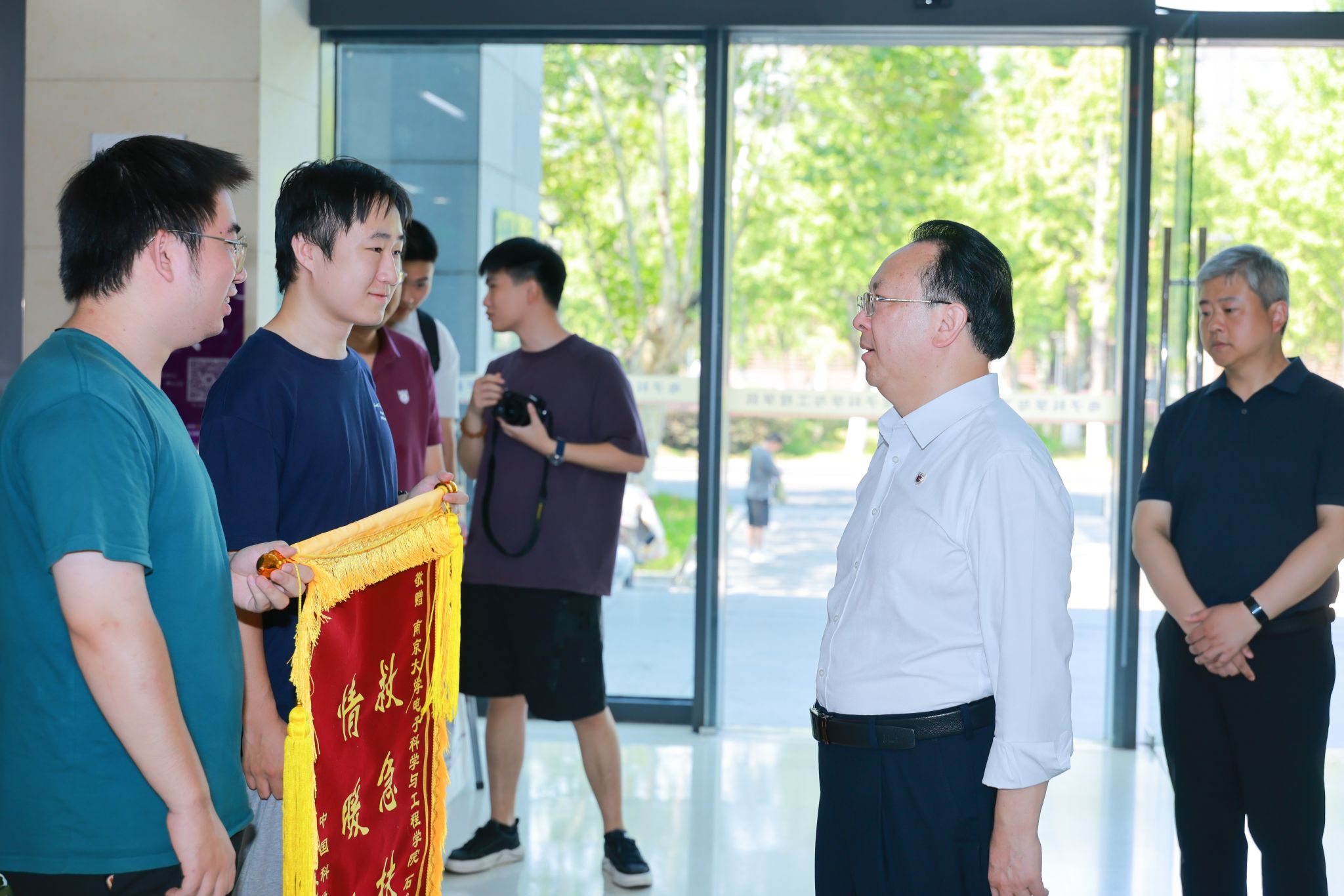 At the School of Electronic Science and Engineering, 2025 doctoral students Shi Junqi and Cong Wuyang showed Tan Tieniu an honorary banner. They had rescued an injured man in a traffic accident on Yuanhua Road on June 27 this year. Tan Tieniu highly praised the two students for their noble deed and encouraged them to continue upholding the spirit of bravery and righteousness. The School set up a rest area for parents, while new students were queuing to complete registration procedures. Tan Tieniu joined the queue and engaged with new students about their study plans and university life. He introduced the new students and parents to NJU's history, campus construction, and other basic information, encouraging students to cherish their valuable learning time and reassuring parents that their children would be well taken care of at NJU.