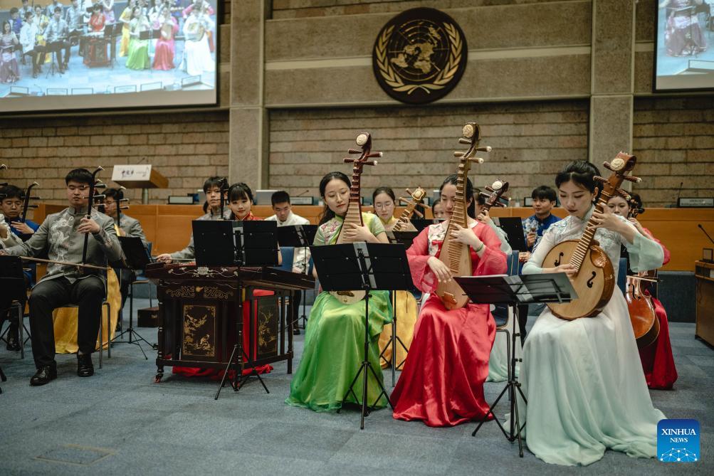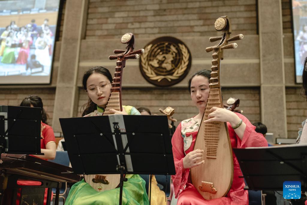 Members of an instrument orchestra of east China's Nanjing University perform during a UN Chinese Language Day event in Nairobi, Kenya, April 19, 2024. The United Nations Office in Nairobi (UNON) and the Chinese Embassy in Kenya celebrated UN Chinese Language Day on Friday with a vibrant event which included calligraphy, lectures and a musical performance. The ceremony featured traditional music from the instrument orchestra of east China's Nanjing University and was attended by senior UN officials, diplomats, students and faculty members from local universities. (Xinhua News Agency/Wang Guansen)