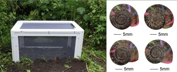 王蜜所在团队养蜗牛的装置和她用指甲油给蜗牛壳做的标记(首次发表,非授权禁止转载)。