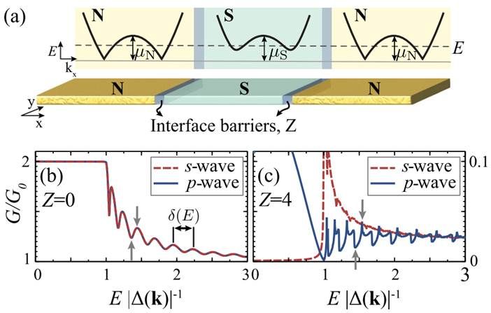 图1:(a)NSN异质结装置图以及不同区域准粒子的色散关系;(b)透明极限下的电导振荡,s波与p波类似;(c)隧穿极限下的电导振荡,s波与p波对比鲜明。