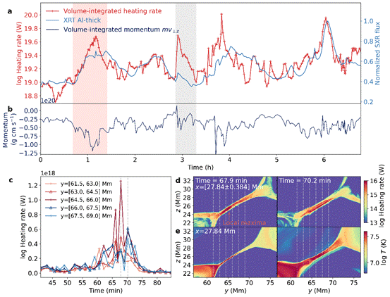 图2:日冕加热率及相关热力学量随时间的演化,清楚展示了电流片区域的总体加热率在长时标上呈现稳定持续的演化,而在局地短时标上具有脉冲式的变化特征。