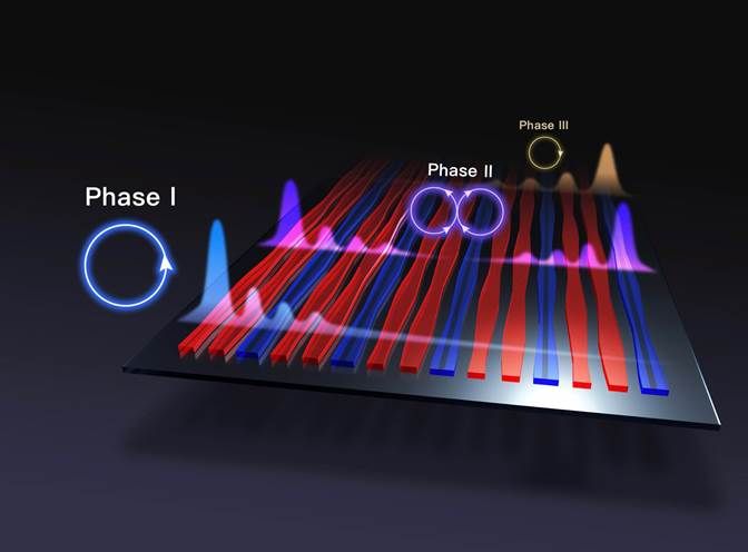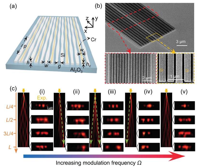 为了进一步实验验证上述的多种拓扑相,研究人员设计了多组不同调制周期 [(i) p = ∞ (无调制), (ii) p = 43, (iii) p = 21, (iv) p = 15, and (v) p = 8 μm]、宽度沿传播方向变化的硅波导阵列,通过在波导上覆盖Cr条而引入损耗,如图3(a,b)所示。为了得到演化趋势,研究人员专门设计了多组不同长度的波导。在实验中,通过将1550 nm波长的激光耦合输入到阵列中间波导,得到输出端的光强信号。可以看到,对于(i)没有调制和(v)高频调制,最终的输出光场是弥散的,而在(ii) p = 43μm, (iii) p = 21μm, (iv) p = 15μm的结果分别是局域在左端、两端和局域在右端,与仿真的光演化趋势基本一致,如图3(c)所示。