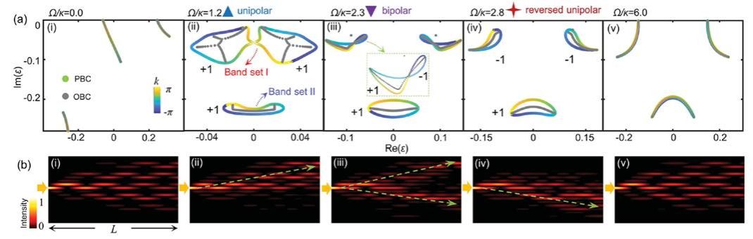 为了进一步研究体系的能谱卷绕情况以及态在三种相的演化行为,研究人员计算了不同调制频率下PBC能谱(图2(a)彩色点)和OBC能谱(图2(a)灰色点)。[这里只考虑上面的低损耗能带band set I.] 对于没有调制情况(Ω/κ=0),PBC能谱和OBC能谱一致,体系没有趋肤效应,对应弥散的演化行为(图2(b)(i))。当体系有调制,例如(Ω/κ=1.2, 2.3, 2.8),PBC能谱呈现复杂的卷绕行为,并与和OBC能谱不一致,其能谱环绕数分别为+1,±1,-1,相应的演化行为分别对应向左传播、向两边传播,再到向右传播。对于高频情况(Ω/κ=6.0),PBC能谱逐渐与OBC能谱一致,对应弥散的演化行为。