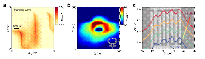 为了检验该系统的各项性能指标,研究团队对多种微波器件进行了近场电磁成像,观察到共面波导的驻波分布、压控振荡芯片的环状微波场分布、交指电容中的峰谷特征等现象(图4)。