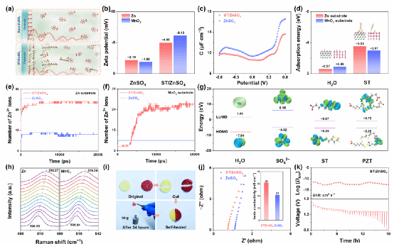 近日,凯发k8官网姚亚刚教授团队提出了一种简便且可规模化的工程策略,通过在ZnSO?电解液中引入硫辛酸钠(ST)分子,在电极与电解质之间构建稳定的双层界面。ST分子具有良好的亲锌性,首先通过调控水合Zn??离子的溶剂化结构,部分置换其水合鞘中的H?O分子,从而优化电解液环境,有效抑制腐蚀并削弱析氢反应。随后,ST阴离子在Helmholtz内层上的特异吸附重构了电双层结构,促进Zn??的脱溶,并通过其捕获Zn??的能力实现界面电荷分布的均匀化。在吸附过程中,界面上的ST分子发生原位聚合,形成由ZnS–有机无定形内层和聚合态硫辛酸锌外层组成的双层结构。其中,内层调节Zn??的离子通量,外层则增强界面的机械强度。值得一提的是,ST分子中的二硫键可发生动态断裂与重组,使聚合界面具备自修复能力,能够修复损伤,并进一步提升电极-电解质界面的自调节性与适应性。凭借这一独特设计,ST增强的锌对称电池在60mAcm??高电流密度下实现了长达7800圈的超长循环寿命;同时,组装的锌锰全电池在2000mAg??下经过10,000圈循环后容量衰减率仅为0.0014%。这一双层界面工程策略为实现长寿命锌锰全电池的发展提供了重要突破。