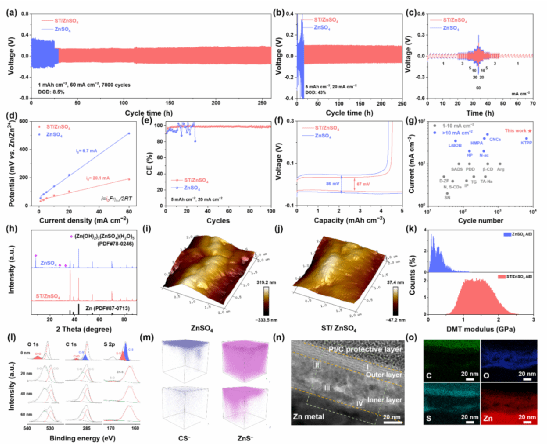 图5所示为ST分子在锌负极和电解液界面的性能展示及形成机理研究。该双层结构的形成显著提升了锌负极/电解质界面的机械强度与化学稳定性,有效阻止了电解液中的H?O与锌电极的直接接触,从而抑制了副反应的发生。凭借这一独特设计,ST增强的锌对称电池在60mAcm??高电流密度下实现了长达7800圈的超长循环寿命。
