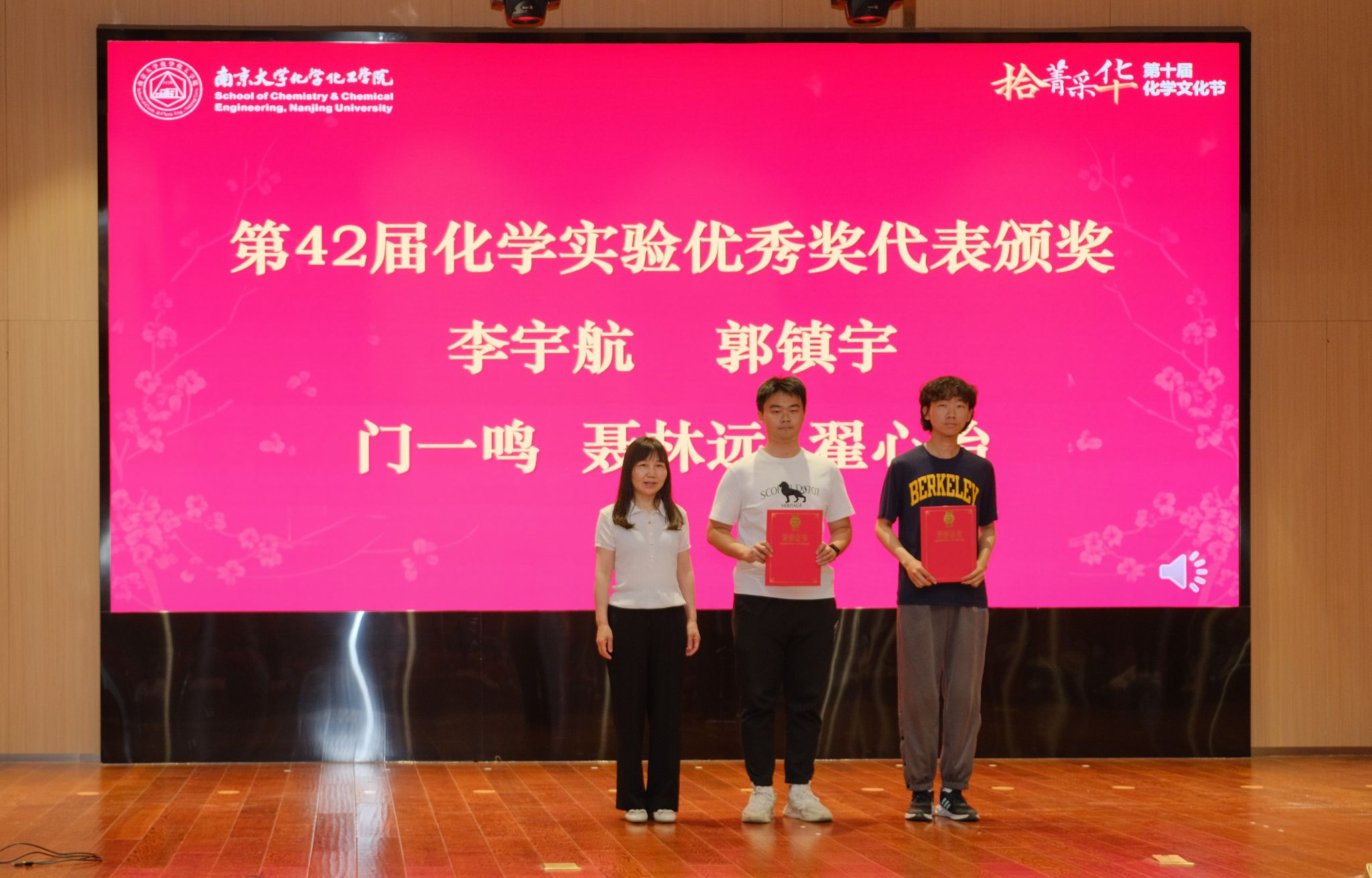 化院党委副书记吴可宣读对第42届化学实验优秀奖的表彰决定,化学国家级实验教学示范中心主任章文伟为获奖学生代表颁奖。1984年戴安邦先生将他获得国家自然科学二等奖的奖金和稿费等收入作为基金,在化学化工学院设立了“化学实验优秀奖”,奖励在化学实验中表现突出的学生和老师。